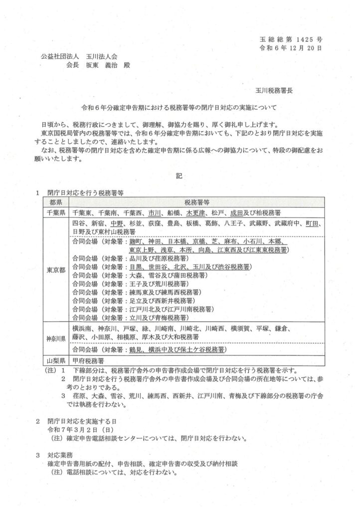 令和6年度分 確定申告期における税務署等の閉庁日対応の実施について
