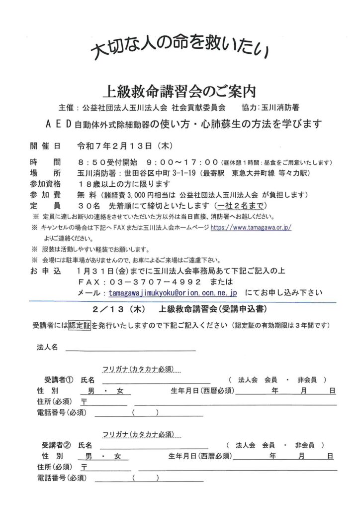 上級救命講習会【満員御礼】※定員となりました。お申し込みありがとうございました。