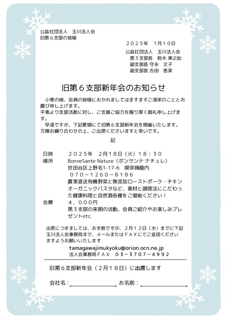 出席につきましては、お手数ですが、2月12日(水)までに下記玉川法人会事務局まで、メールまたはFAXにてご返信くださいますようお願いいたします