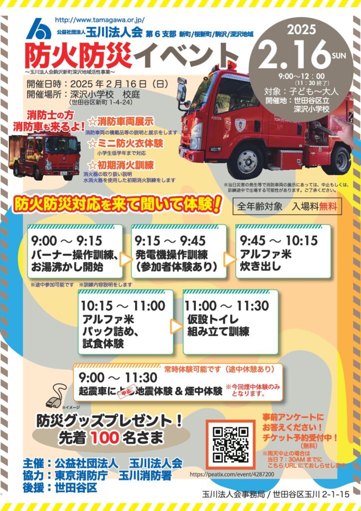 どなたでも 第6支部 防火防災イベント 詳細はちらしPDFをご覧ください 日 時: 令和7年2月16日(日) 13:00 ~ 14:00 主 催: 第6支部 場 所: 深沢小学校 校庭 参加費: 無料 お申し込みはメールもしくは下記参加お申込みボタンから※人数に制限があるものもございますのでお早めにお申し込みください。 参加お申し込み Page Top